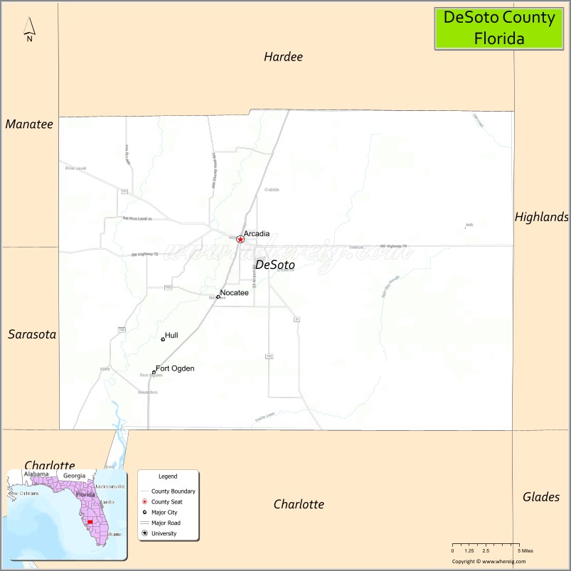 Map of DeSoto County - DeSoto County is a county located in the U.S. state of Florida. DeSoto County Map showing cities, highways, important places and water bodies. Get Where is DeSoto County located in the map, major cities in DeSoto county, population, areas, and places of interest.